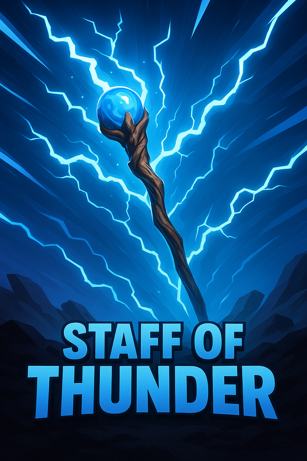 /Collection: /by davooda/Type: PNG/A striking illustration of a thunder staff, featuring vibrant electric bolts emanating from a blue orb atop a wooden staff, set against a deep gradient background.