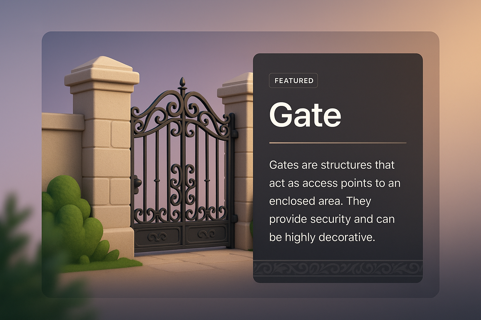 A modern web page design featuring a decorative gate illustration. It includes text blocks, labels, and a dark panel seamlessly integrated into the design.