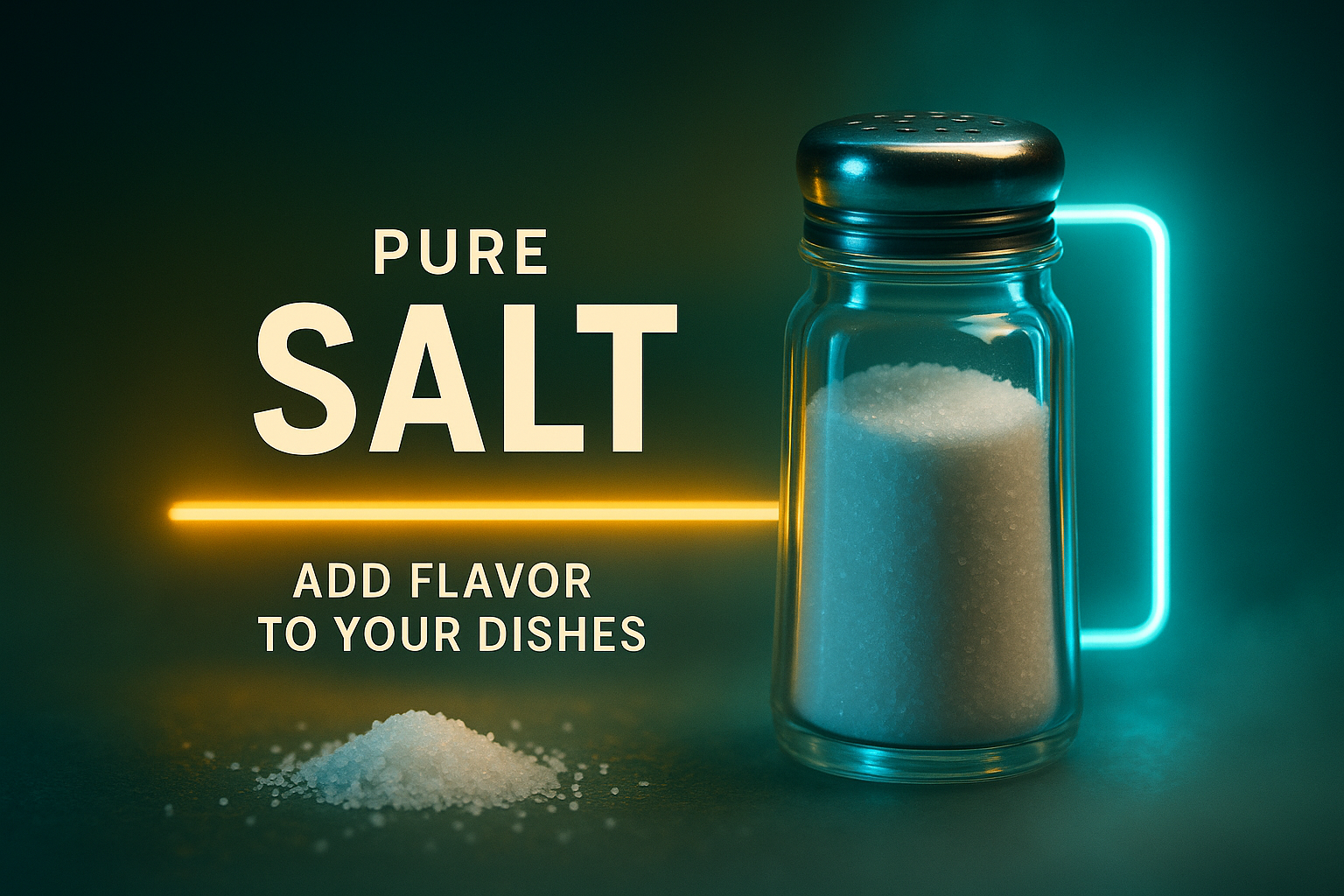 A captivating neon advertisement featuring a glass salt shaker with pure salt, glowing accents, and engaging text promoting flavor enhancement for dishes.
