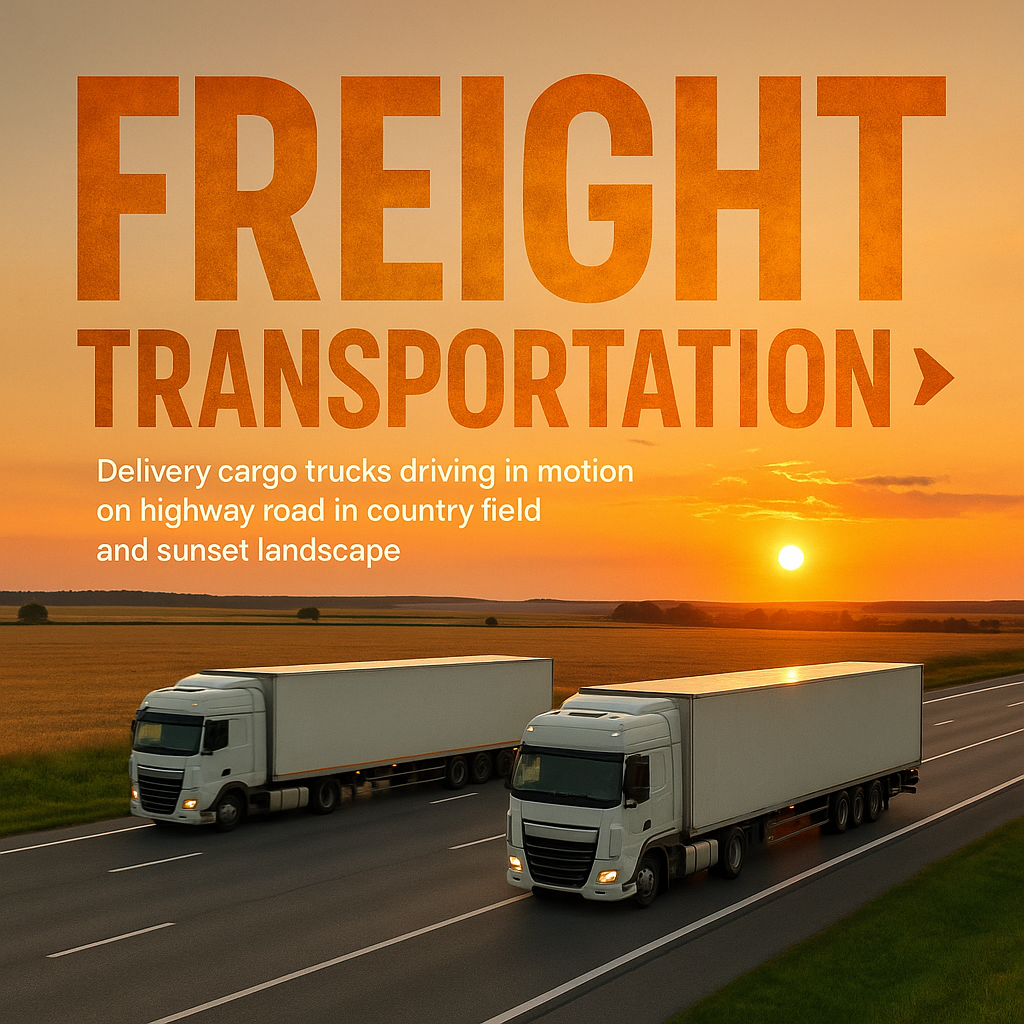 Dynamic Freight Transportation Scene with Trucks at Sunset