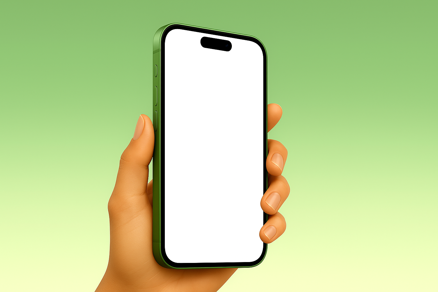 A green smartphone is held in a hand, viewed from above. The screen is blank, set against a soft gradient background.