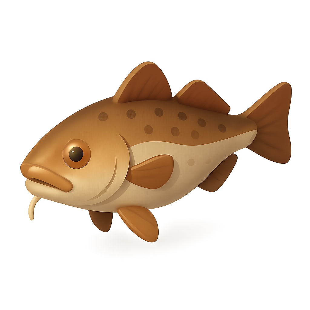 A stylized 3D icon of an Atlantic cod fish, featuring a three-quarter view with a smooth, volumetric design. The fish has a light brown body with darker spots and fins, set against a soft gradient background.