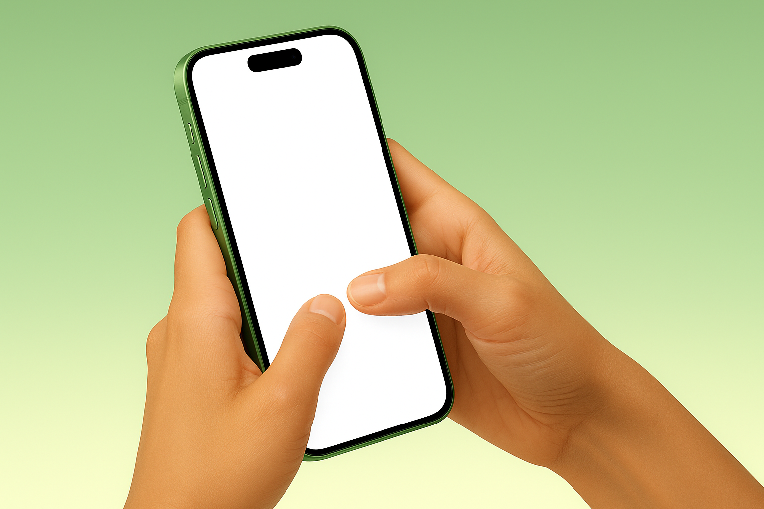 A pair of hands hold a green smartphone with a blank white screen. The phone features rounded edges and is positioned against a soft gradient background.