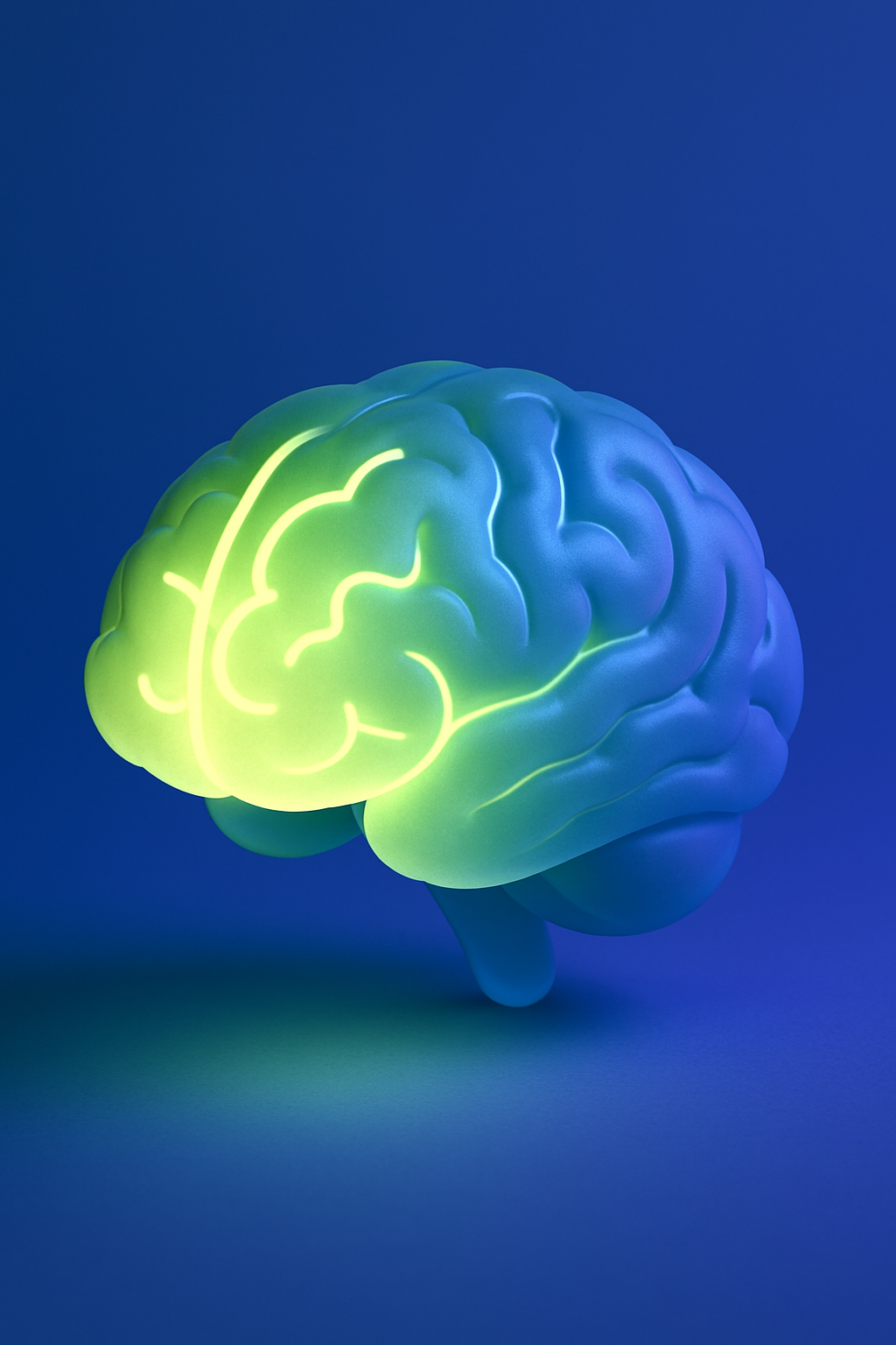 A realistic 3D representation of a glowing brain icon, featuring light yellow-green illumination, solid blue, and violet accents. The composition showcases the brain in a shadowy environment, emphasizing its glow.