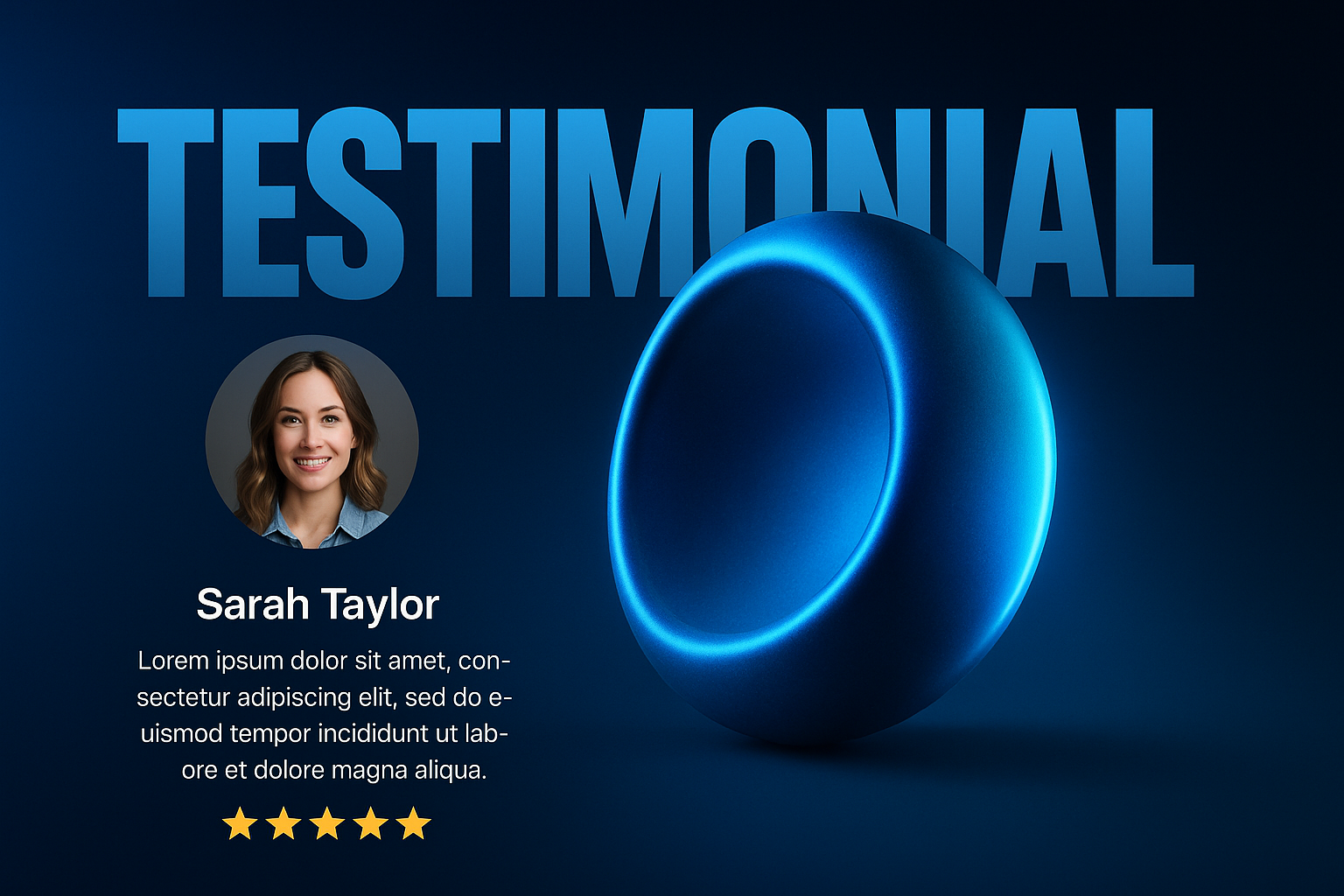 A striking testimonial layout featuring a circular photo, name, and text on a modern blue gradient background. The design includes a 3D object with glowing accents and a bold headline.