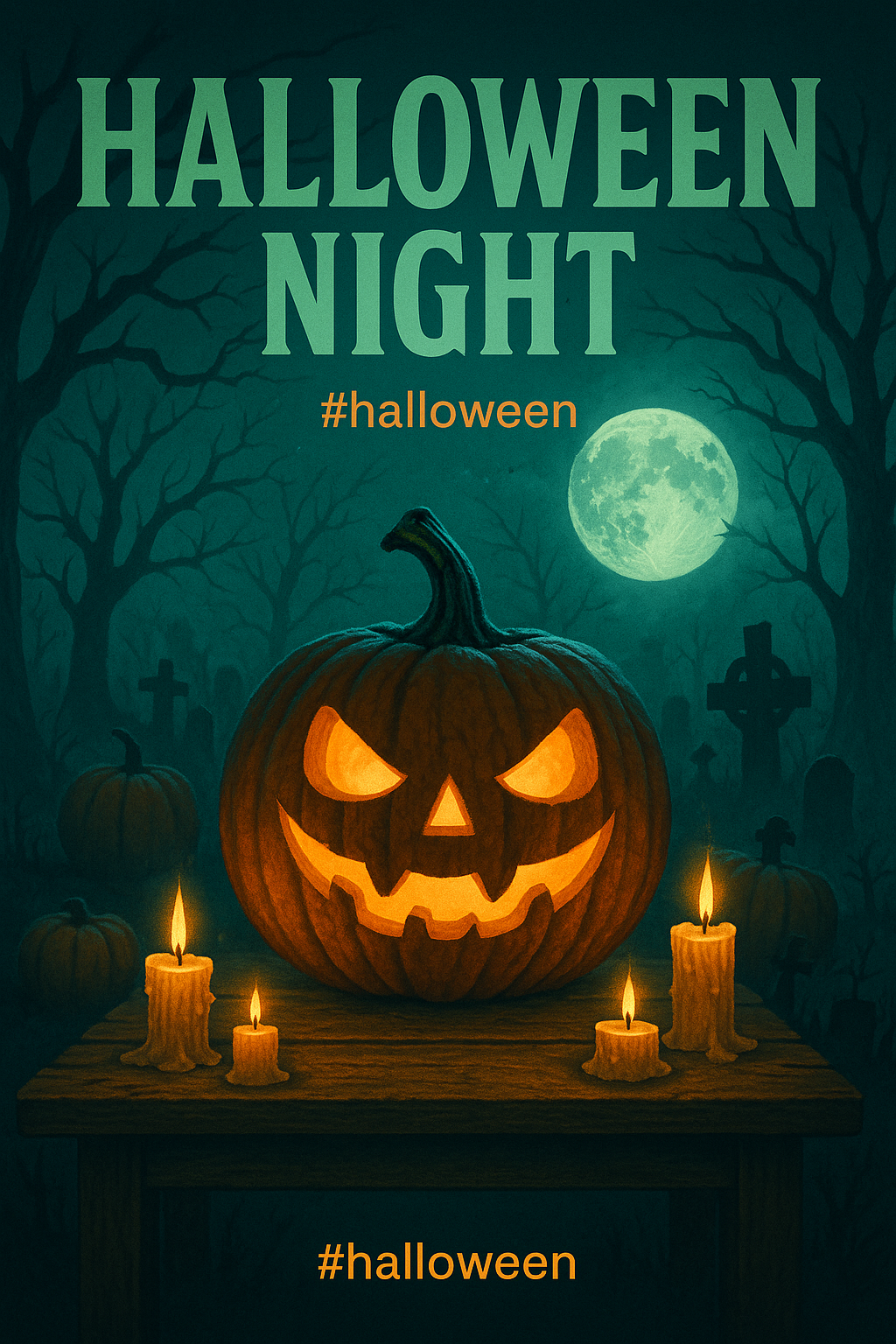 Illustrative Halloween-themed graphic featuring a carved pumpkin, candles, and a moonlit graveyard background, perfect for seasonal promotions or events.