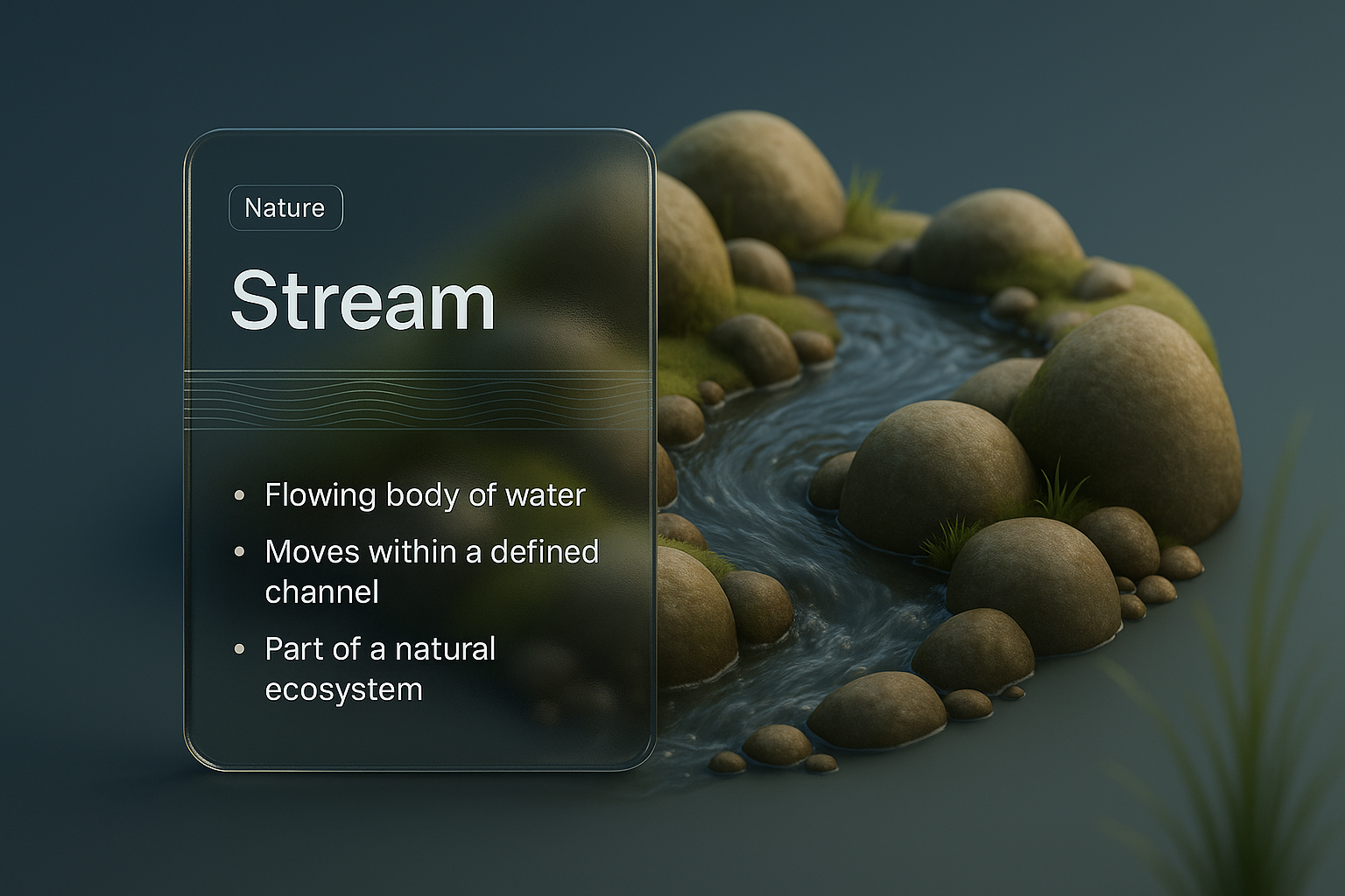 /Collection: /by davooda/Type: PNG/A visually striking 3D illustration featuring a flowing stream surrounded by smooth rocks and greenery. The design includes two integrated panels with information about streams, emphasizing a natural ecosystem.