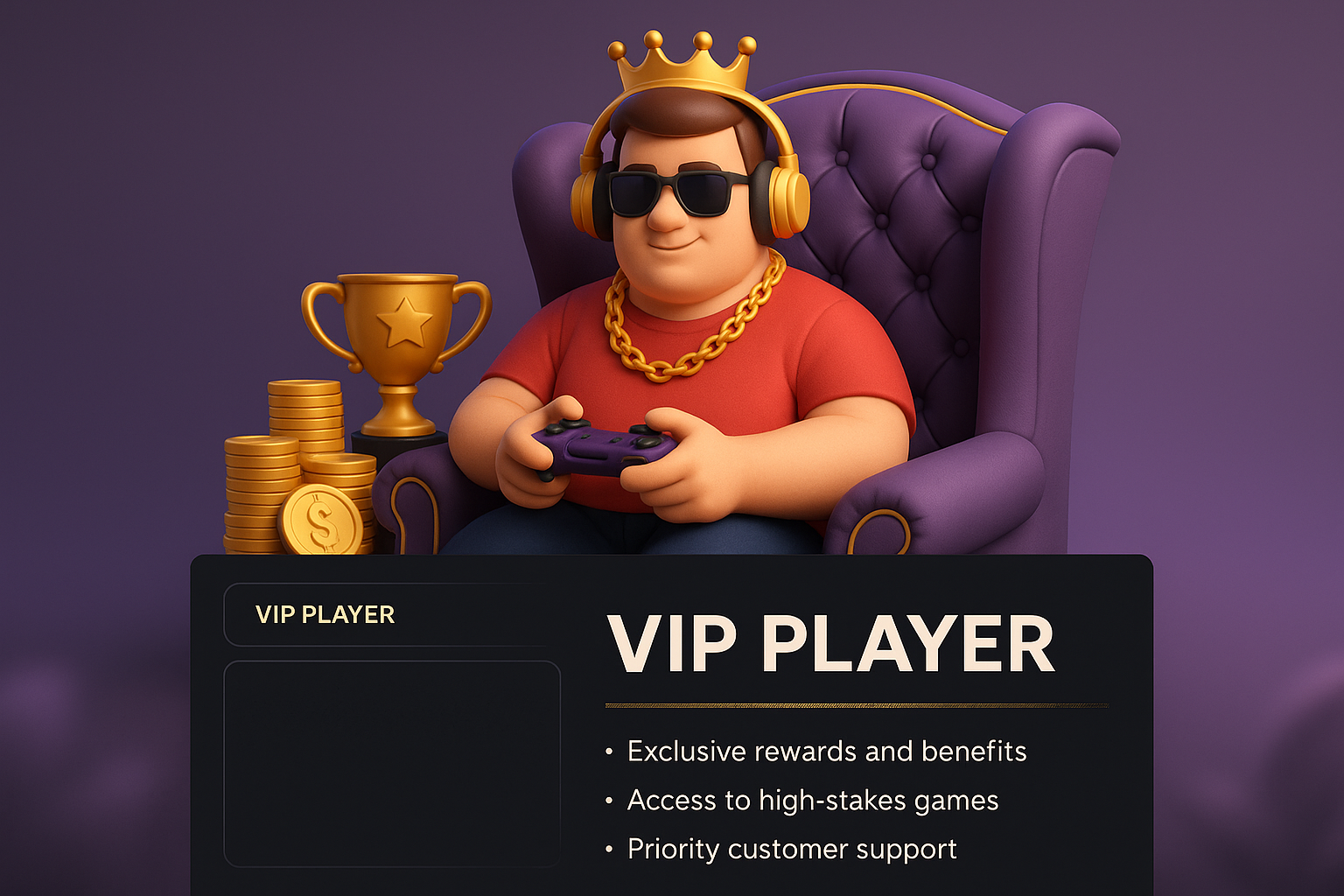 /Collection: /by davooda/Type: PNG/A 3D illustration featuring a VIP player sitting on a throne with gaming accessories. The design includes a dark banner with text and icons highlighting exclusive rewards and support.