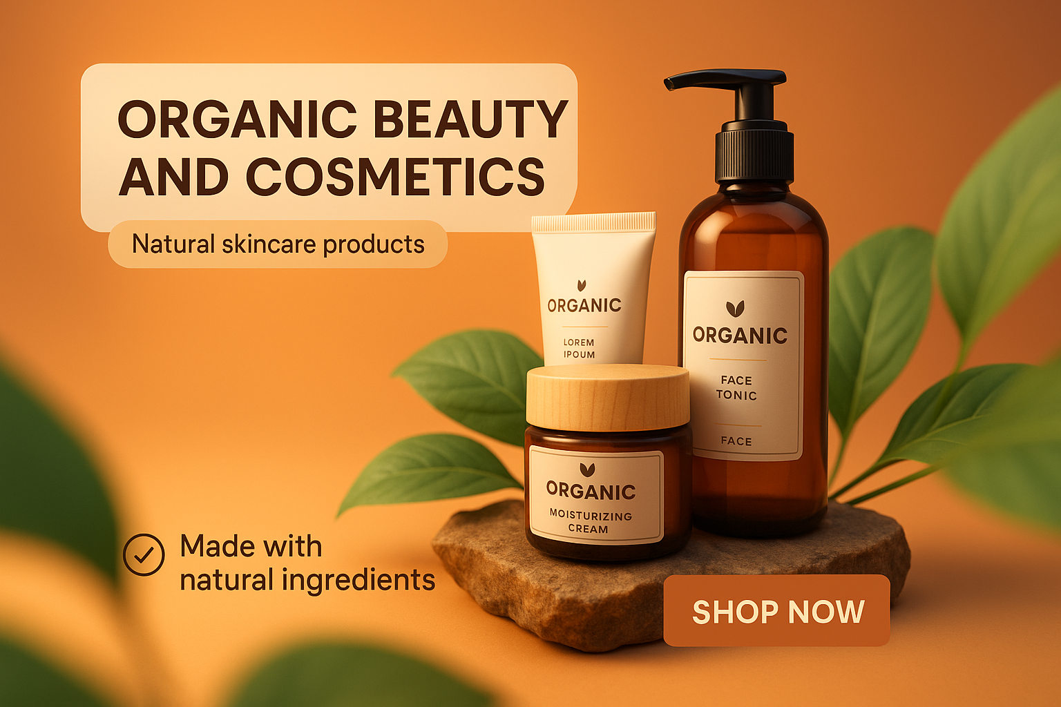 A visually appealing product display showcasing organic skincare items against a warm, earthy background. Ideal for beauty and wellness marketing.