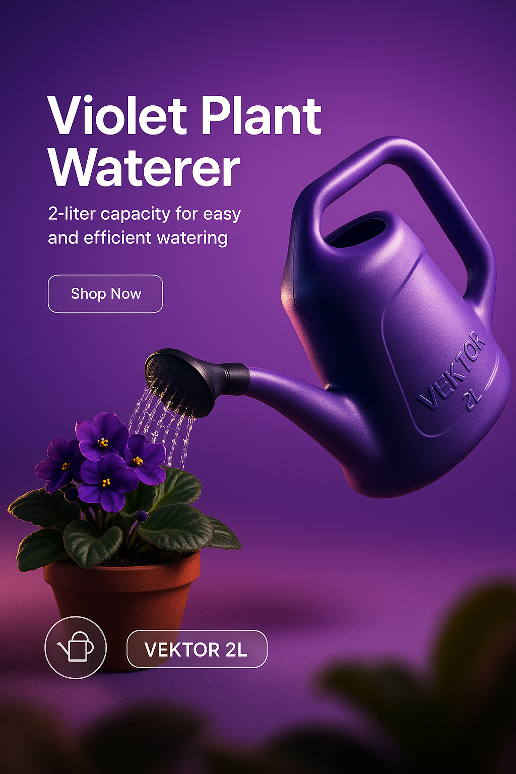 This promotional image showcases a violet watering can alongside a blooming plant. The vibrant colors and modern design appeal to gardening enthusiasts. Ideal for social media marketing.