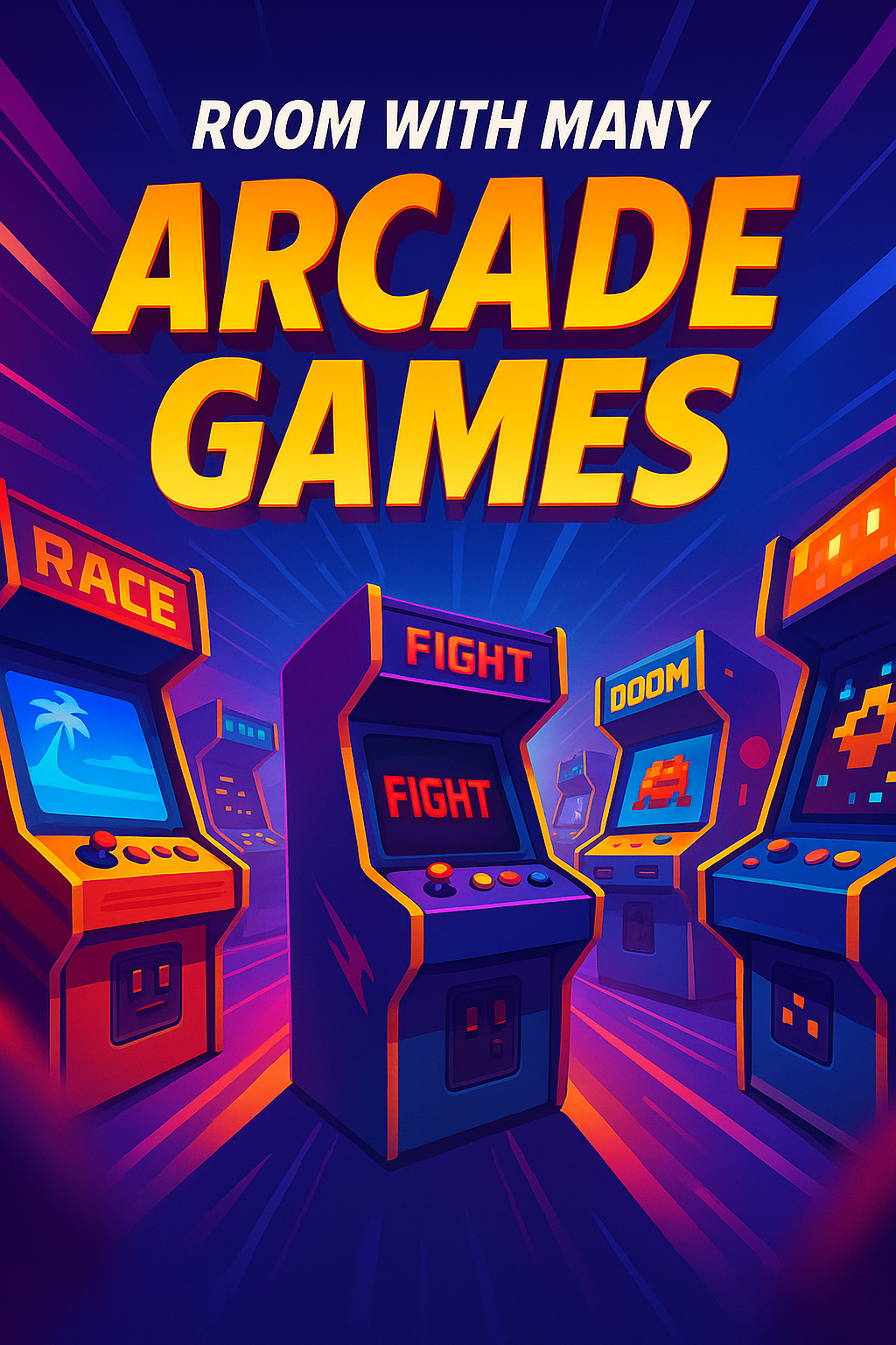 Dynamic Arcade Adventure Scene with Colorful Game Cabinets