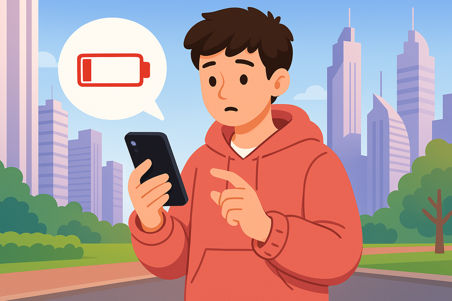 /Collection: /by davooda/Type: PNG/Digital illustration depicting a young man looking worriedly at his smartphone with a low battery notification, set against a modern cityscape background. Suitable for tech-related content or battery awareness campaigns.