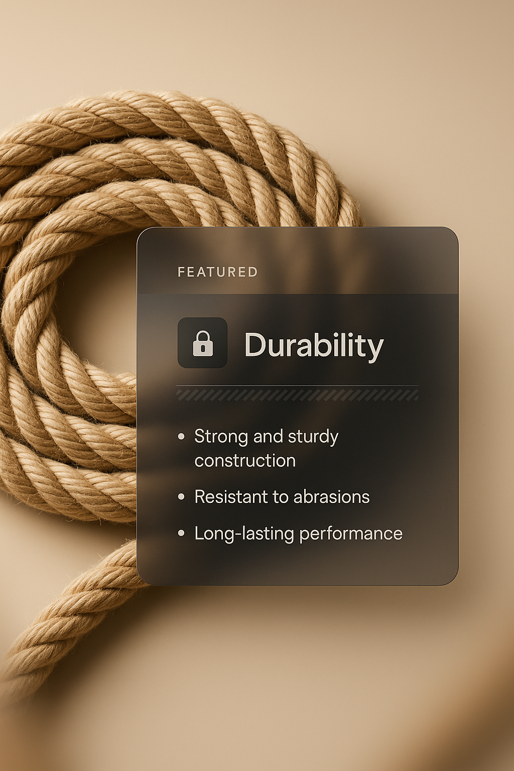 /Collection: /by davooda/Type: PNG/A detailed 3D illustration of a rope coil set against a smooth gradient background. An overlay features a translucent label highlighting durability, with bullet points about its features.