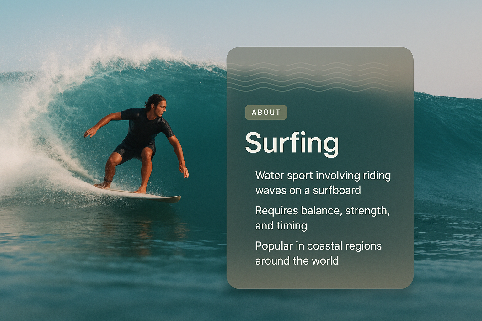A vibrant image of a surfer riding a wave, complemented by an integrated informational block. The design features a smooth gradient background and a stylish overlay with clear text.