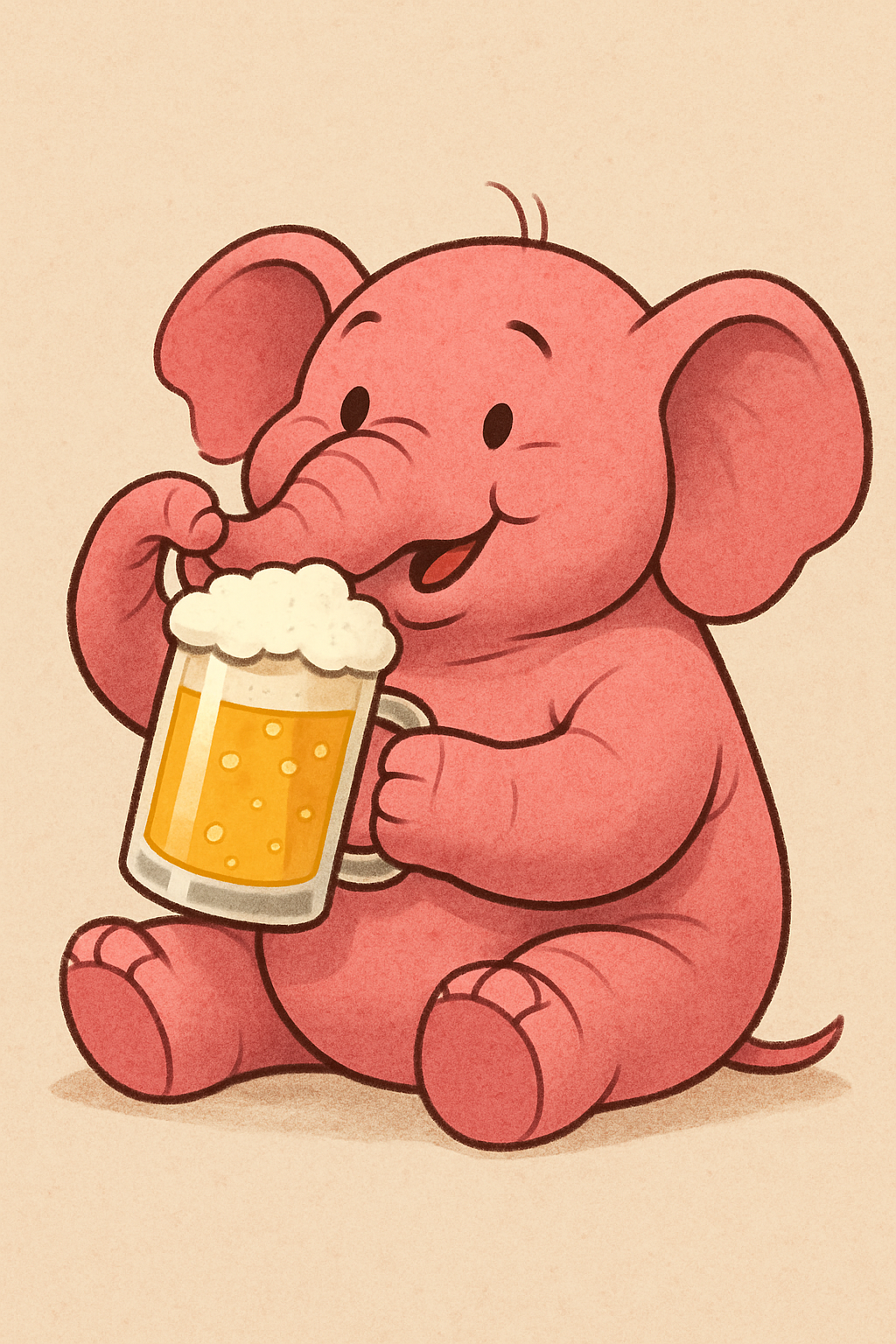 Whimsical cartoon illustration of a pink elephant cheerfully sipping from a beer mug, perfect for playful designs and merchandise targeting a lighthearted audience.