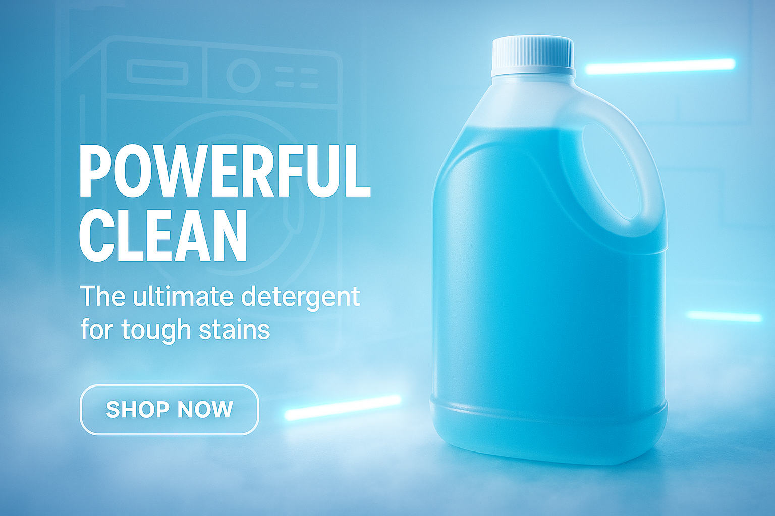 Vibrant promotional graphic featuring a blue laundry detergent bottle with a clean design, aimed at attracting consumers for tough stain solutions.