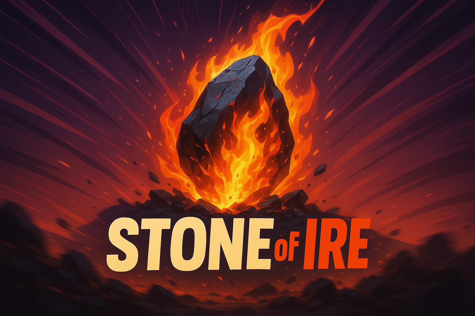 /Collection: /by davooda/Type: PNG/A striking illustration of a stone surrounded by vibrant flames, showcasing dynamic lines radiating from the center. The bold typography emphasizes the title 'STONE of IRE' in a captivating layout.