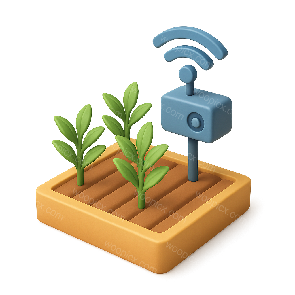 This image showcases a 3D icon representing agriculture technology, featuring plants and a sensor device, designed in a vibrant, isometric style.