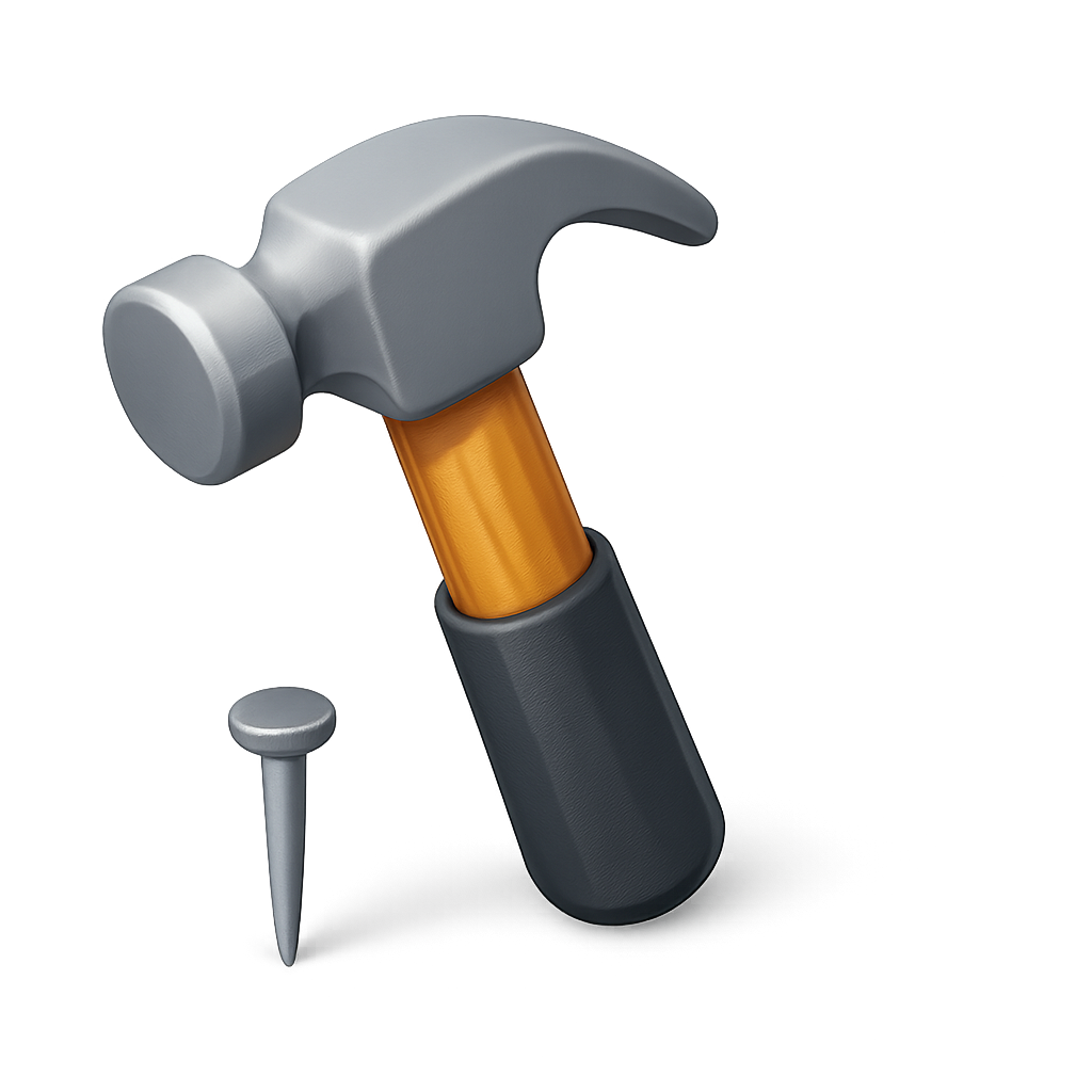 A sleek 3D representation of a hammer with a metallic finish, featuring a wooden handle and a nearby nail. The isometric view and volumetric design give it a modern look.