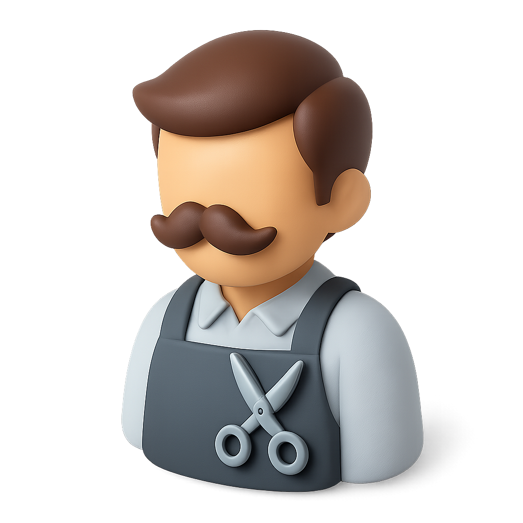 /Collection: /by davooda/Type: PNG/A simple 3D icon of a barber in a three-quarter view, featuring a stylized figure with a mustache, wearing an apron and holding scissors, set against a soft gradient background.