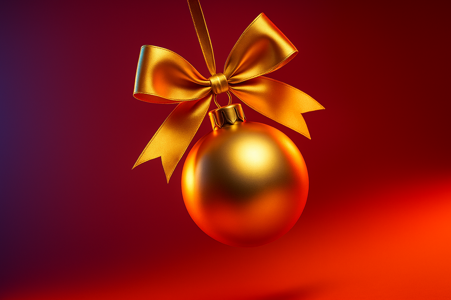 A beautifully crafted gold Christmas ball adorned with a vibrant ribbon and bow, elegantly suspended in a dynamic, colorful background. The lighting enhances its features.