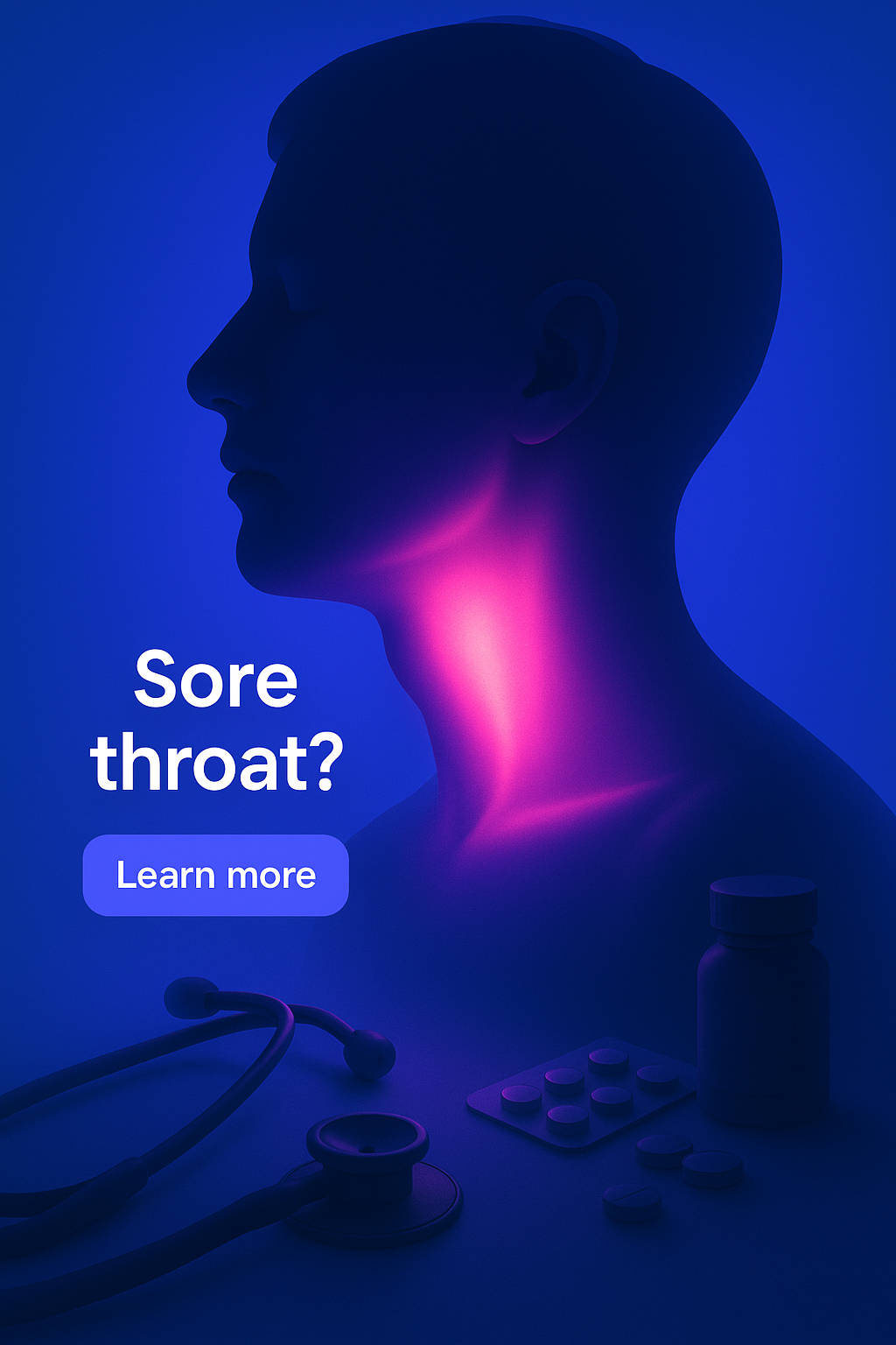 /Collection: /by davooda/Type: PNG/A stylized illustration featuring a silhouette of a head with a glowing throat area. The throat emits a neon-pink light against a solid blue background, surrounded by medical objects like a stethoscope and pill bottles, creating a cohesive, informative scene.