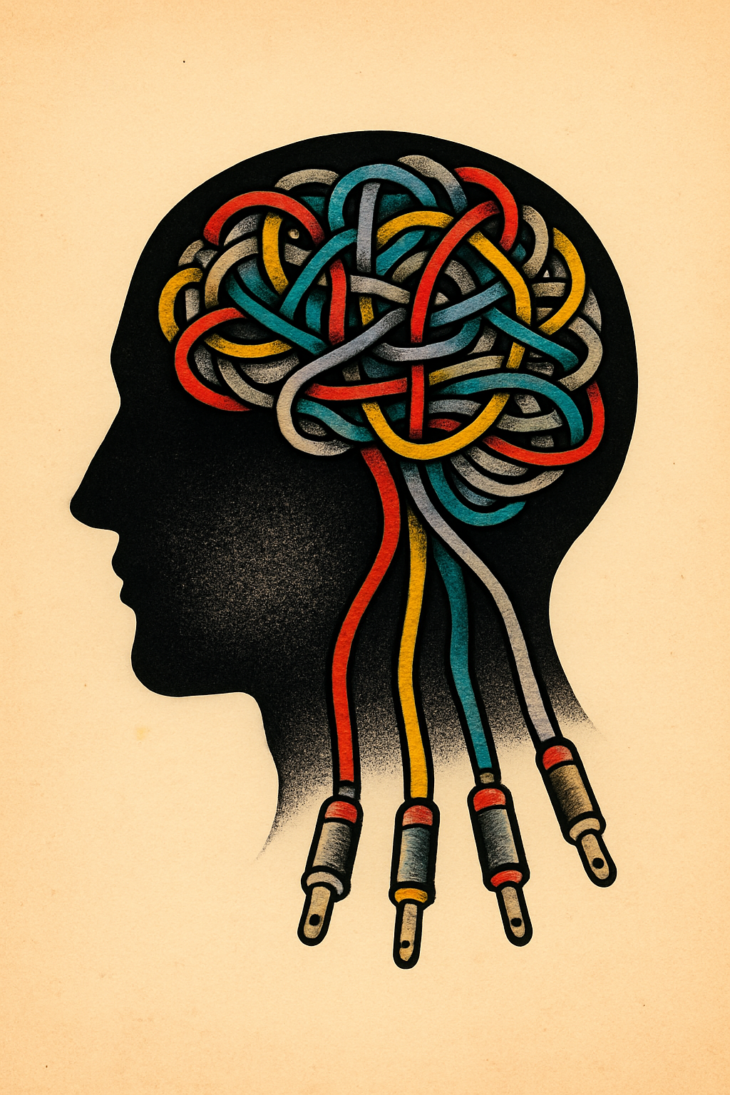 /Collection: /by davooda/Type: PNG/A detailed silhouette of a head featuring a brain made of colorful wires. The design is set against a light beige background, showcasing a blend of artistic tattoo styles.