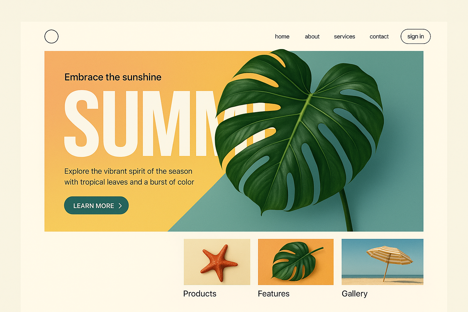 /Collection: /by davooda/Type: PNG/A modern summer greeting poster featuring a large tropical leaf and bold typography. The design includes a gradient background with complementary colors, enhancing the seasonal theme.