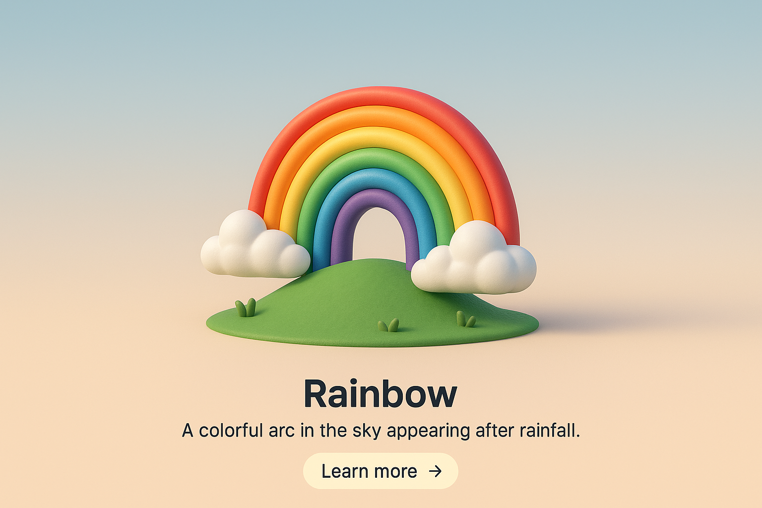 A visually appealing 3D representation of a rainbow arching over a grassy hill with fluffy clouds. The scene is designed with a smooth gradient background emphasizing realism.