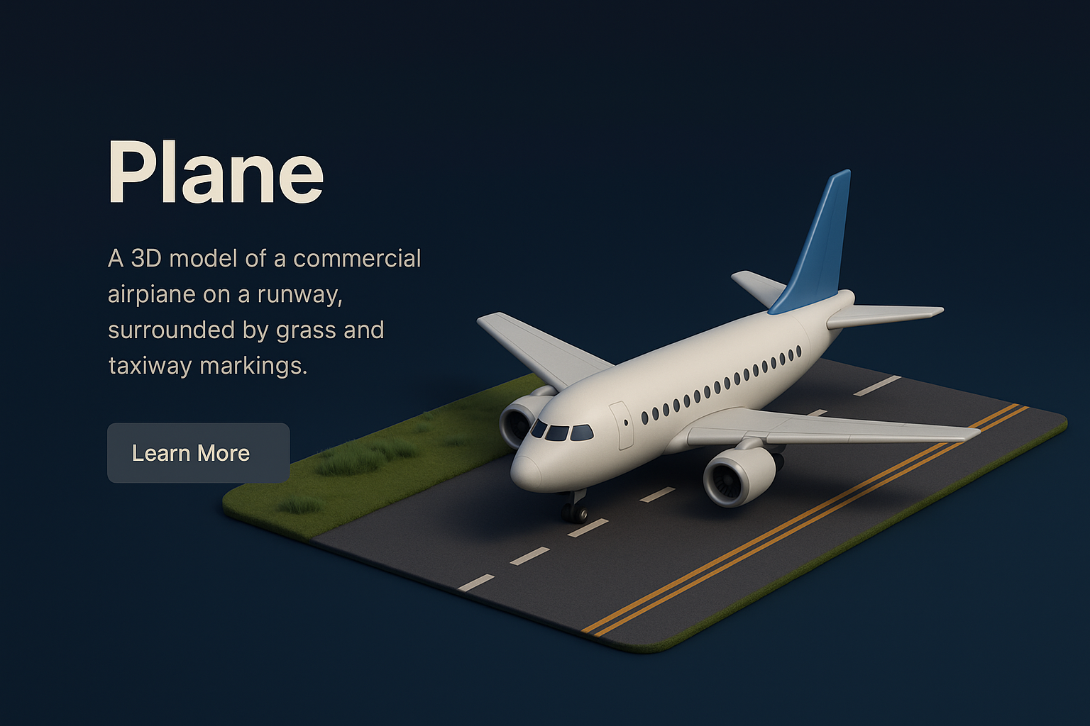 A realistic 3D representation of a commercial airplane on a runway, surrounded by grass and taxiway markings. The scene is designed with a dark gradient background, emphasizing the aircraft.