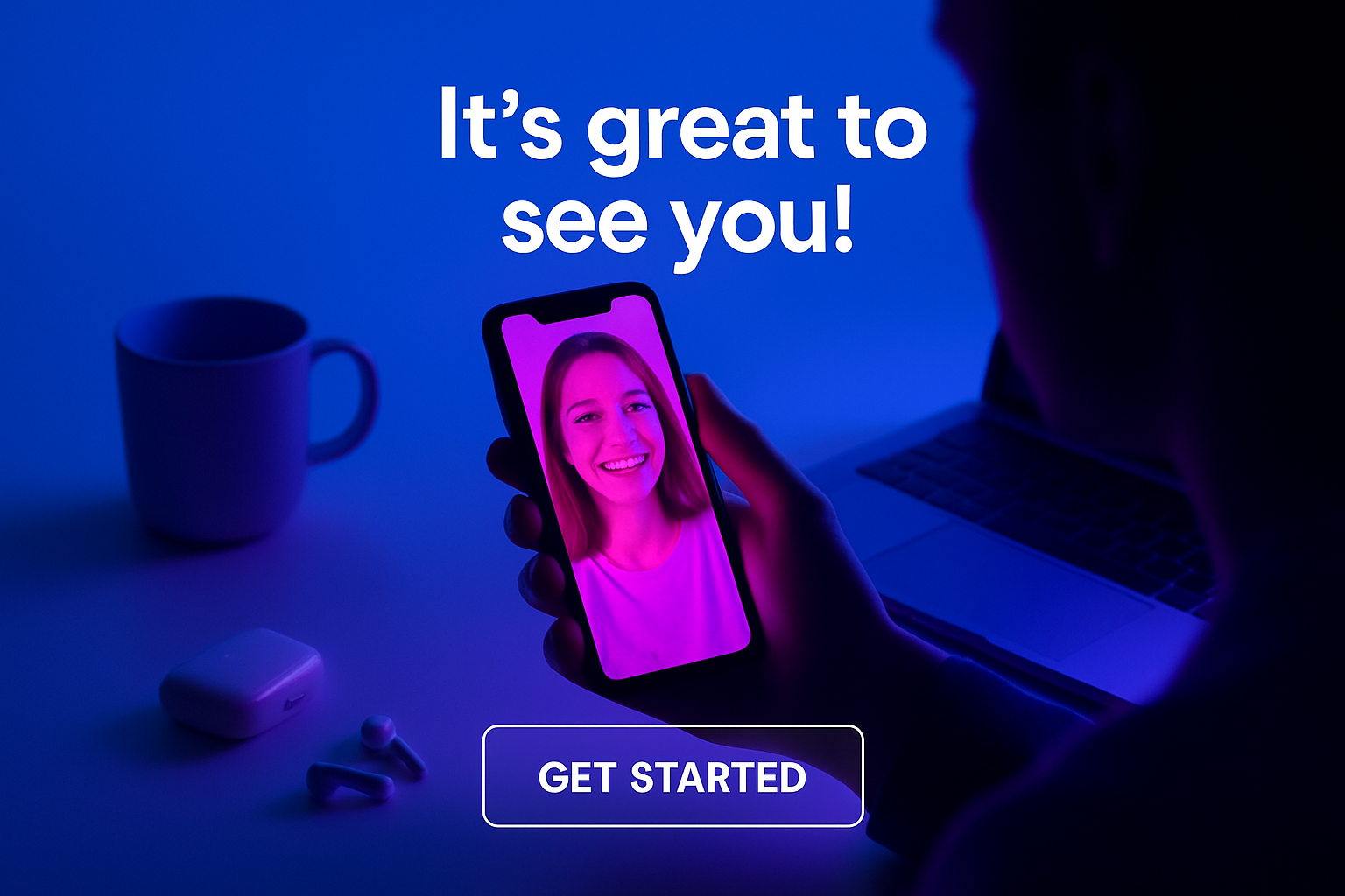 /Collection: /by davooda/Type: PNG/A person engaged in a video call holds a phone emitting a neon-pink glow, illuminating the scene with cool shades of blue and violet. The background is a solid blue color, enhancing the vibrant atmosphere.