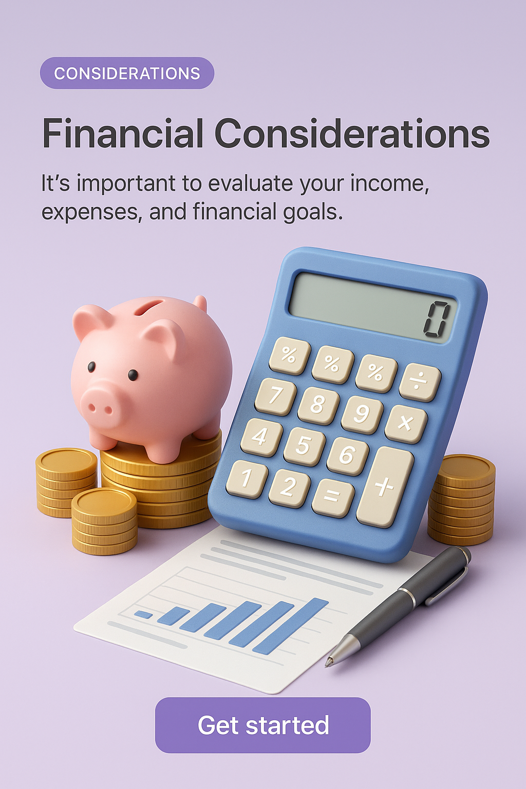 /Collection: /by davooda/Type: PNG/A realistic 3D illustration featuring a calculator, piggy bank, and financial charts. The design emphasizes financial considerations with a smooth gradient background.