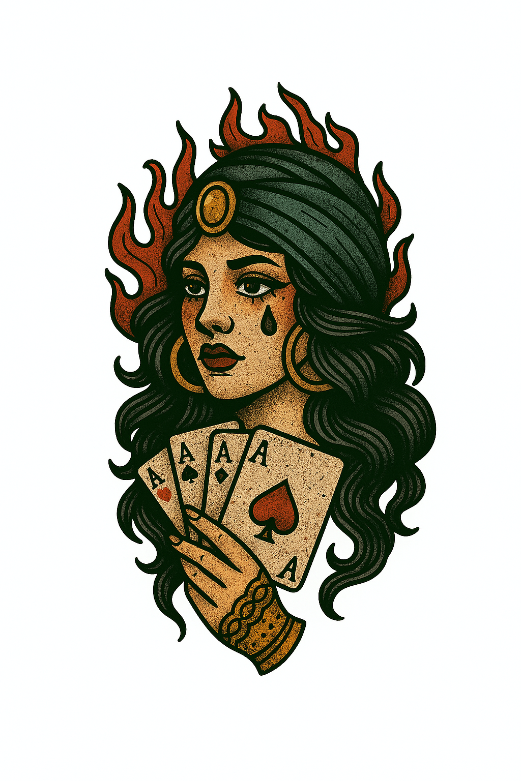 /Collection: /by davooda/Type: PNG/An artistic illustration of a woman holding playing cards, surrounded by flames. The design combines vintage and modern styles, perfect for tarot-themed projects or graphic design.