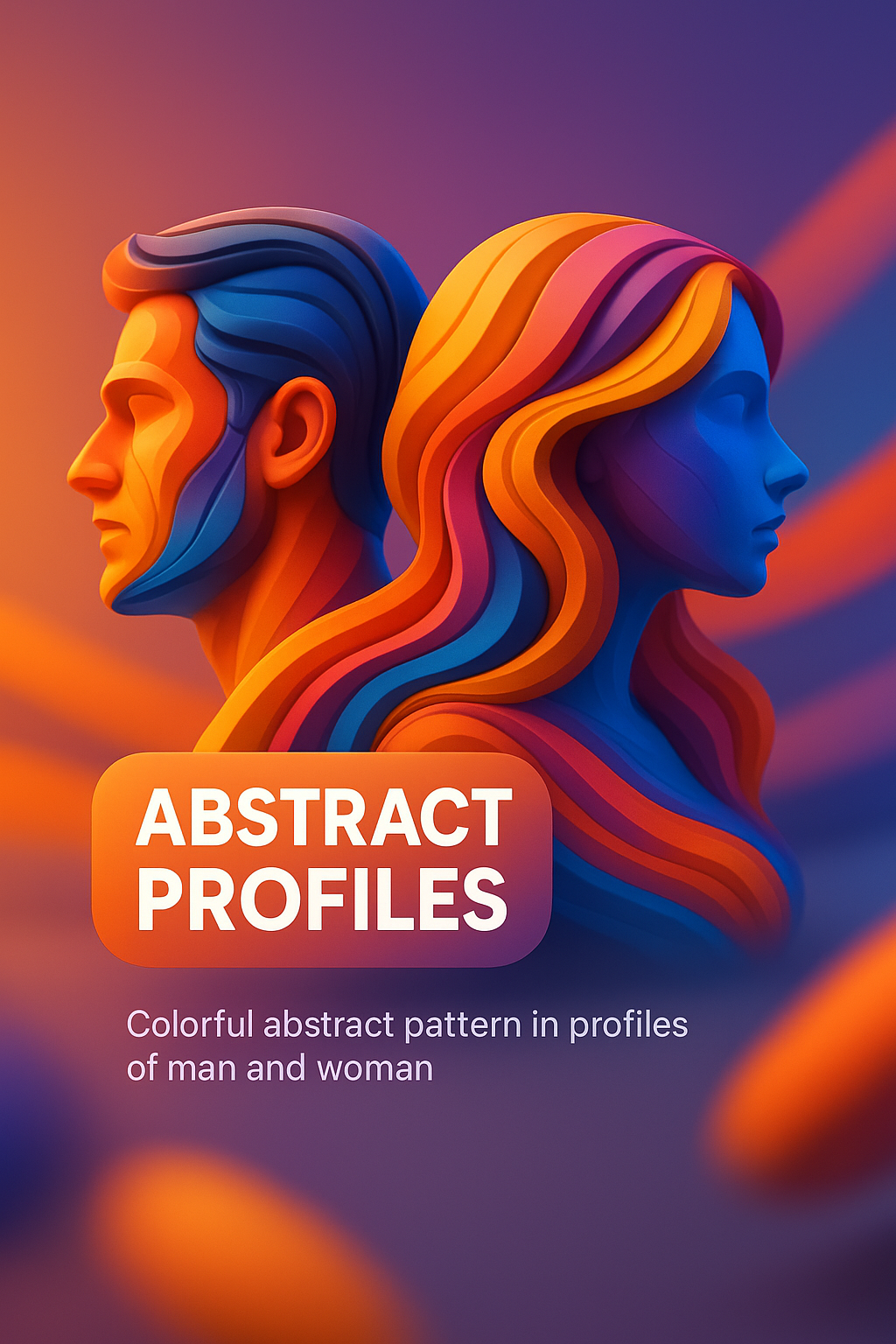 This vibrant graphic features abstract 3D profiles of a man and woman, showcasing a colorful design ideal for modern art themes and social media.