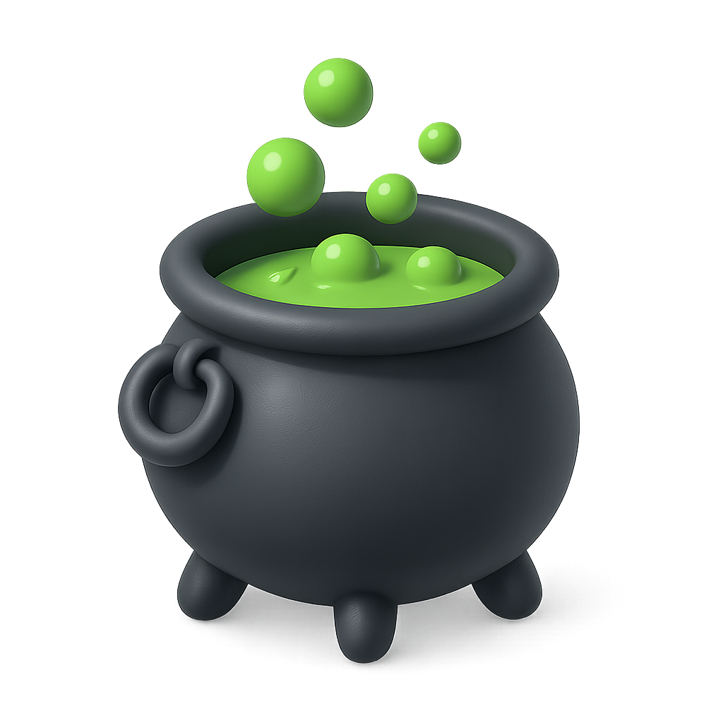 A stylized 3D cauldron illustrated with green bubbling liquid, viewed from a three-quarter angle. The cauldron has a smooth texture and rounded edges, enhancing its volumetric appearance.