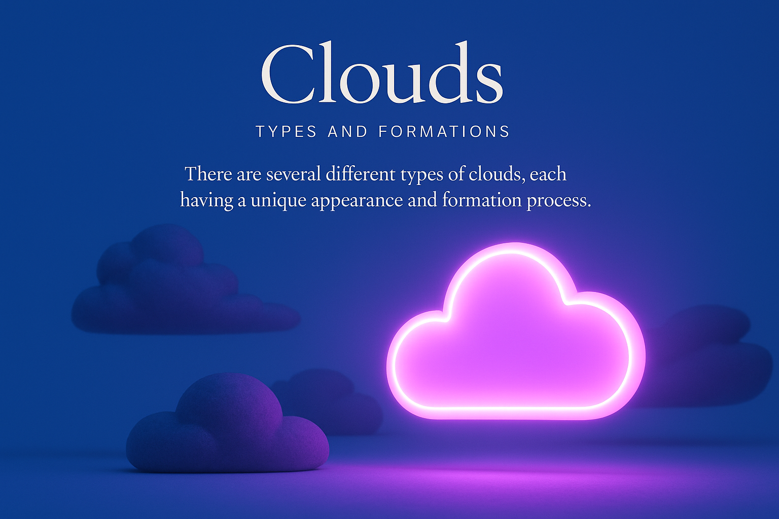 A captivating scene featuring stylized clouds against a solid blue background. One cloud emits a vibrant neon pink glow, casting cool shades across the surrounding clouds, creating an ethereal atmosphere.
