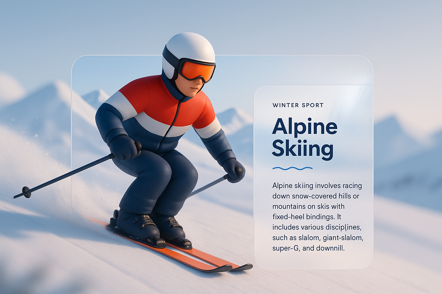 A 3D illustration depicting a skier racing down snow-covered mountains. The design features transparent elements and layered composition for depth.