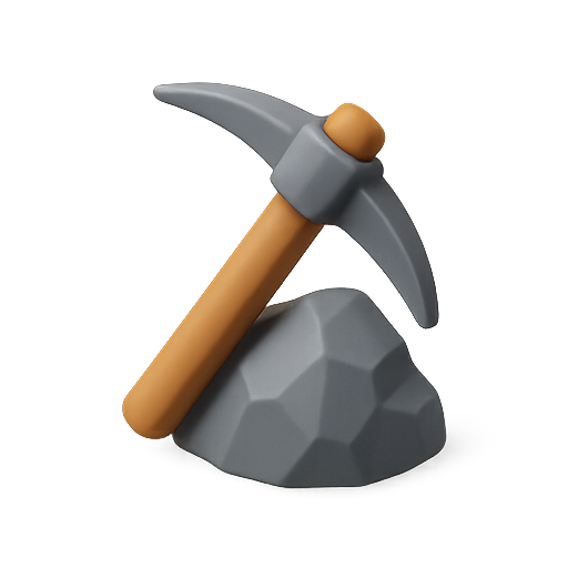 Stylized 3D icon featuring a pickaxe resting on a rock, representing mining or excavation themes. Ideal for educational materials or gaming applications.