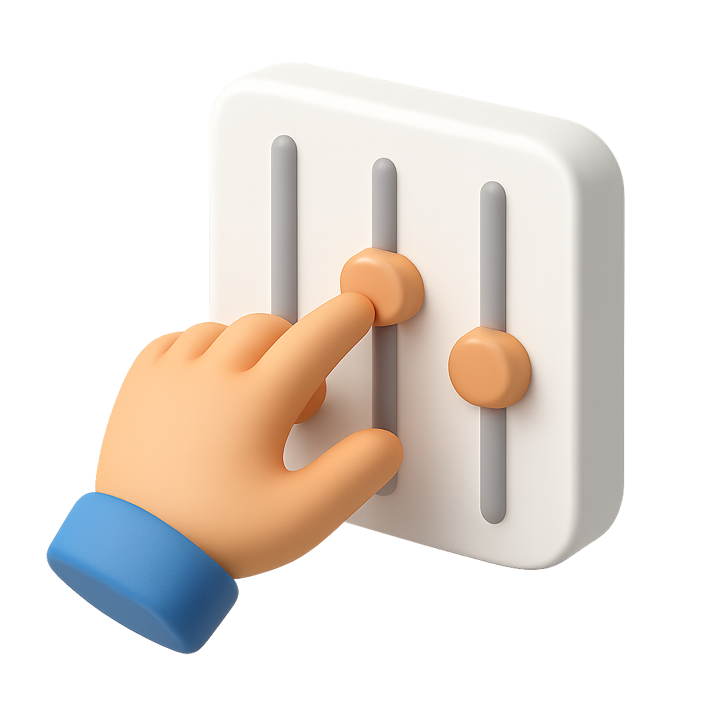 /Collection: /by davooda/Type: PNG/A stylized 3D icon depicting a hand adjusting sliders on a control panel. The icon features a transparent background and a three-quarter view, enhancing its volumetric appearance.