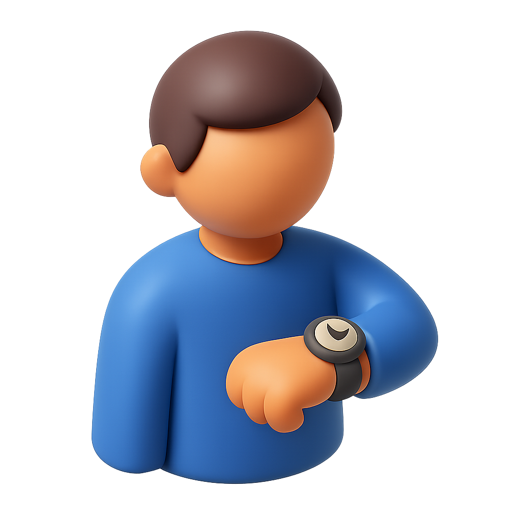 A stylized 3D icon depicting a person with a blue shirt checking the time on their watch. The character is shown in a three-quarter view with a soft, volumetric design against a dark background.