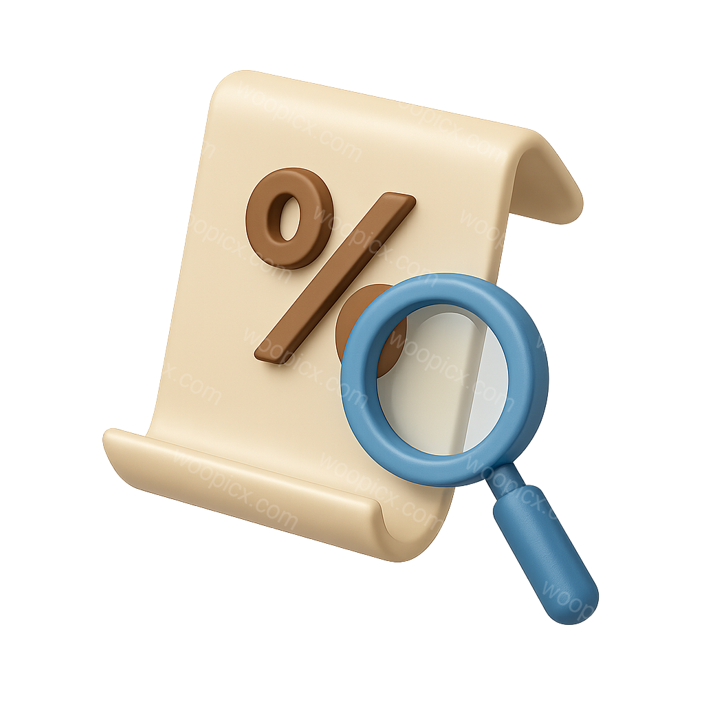 /Premium/Collection: /by davooda/Type: PNG/The image features a 3D styled paper with a percentage sign and a magnifying glass, designed in a three-quarter view with a transparent background, emphasizing financial insights.