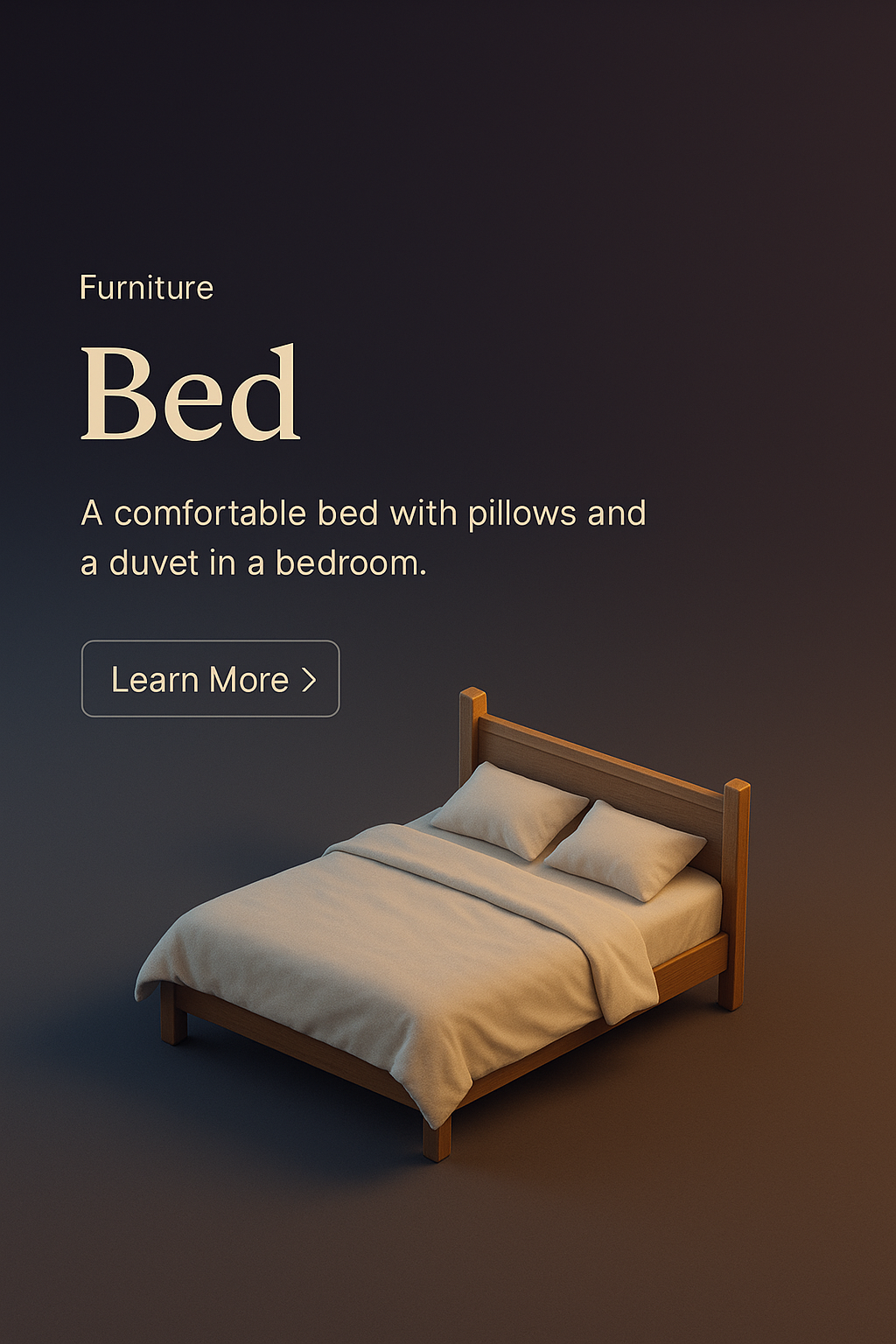 A realistic 3D rendering of a comfortable bed with pillows and a duvet, set against a dark gradient background. The scene captures a cozy atmosphere with a focus on the bed's details.