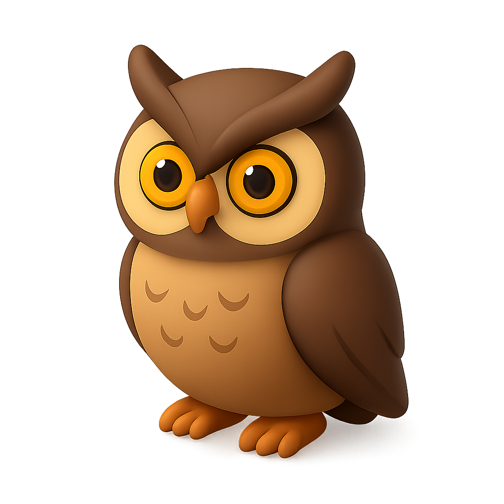 A charming cartoon owl illustration featuring bright colors and a friendly expression, perfect for children's books, educational materials, or decor.