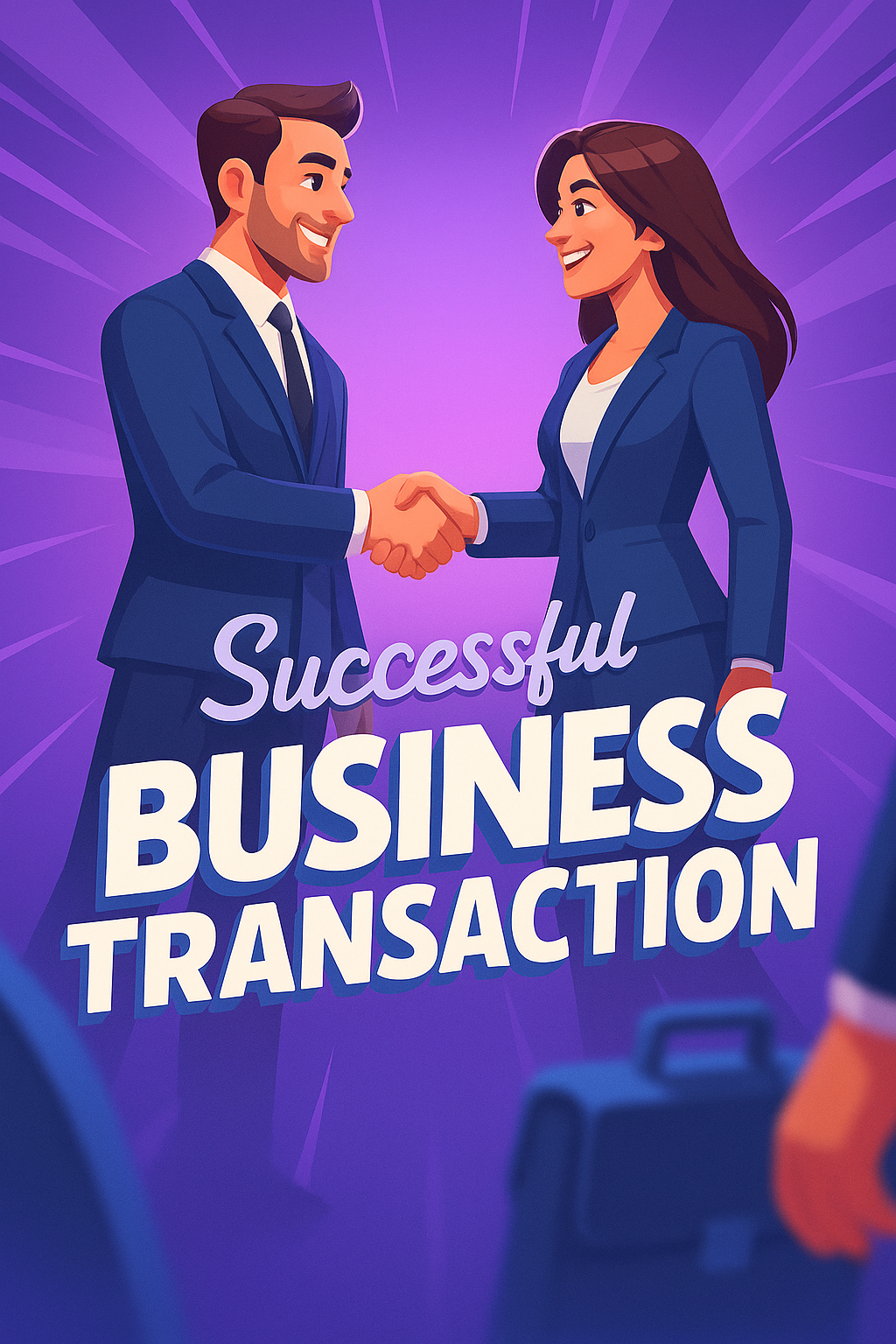A dynamic illustration featuring a man and woman in business attire engaging in a warm handshake, set against a gradient background. The title 'Successful BUSINESS TRANSACTION' is prominently displayed.