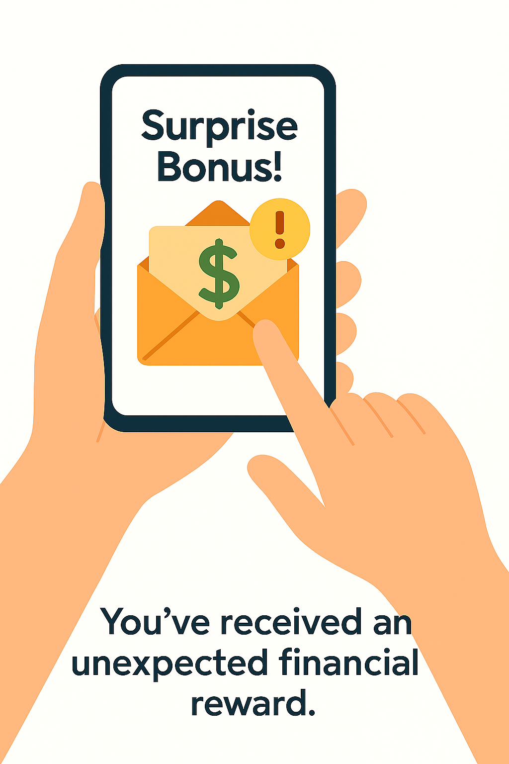 /Collection: /by davooda/Type: PNG/Illustrative graphic of a smartphone displaying a surprise financial reward notification, featuring a hand interacting with the screen. Ideal for financial apps or promotional materials.