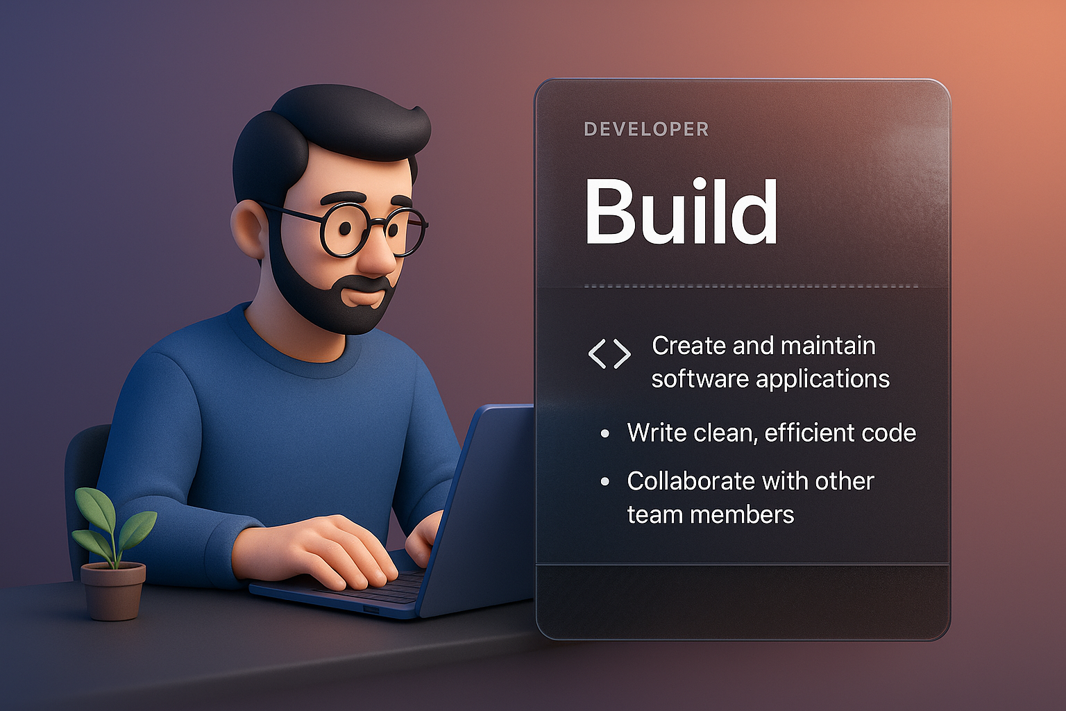 /Collection: /by davooda/Type: PNG/A 3D illustration of a developer working on a laptop, with a stylish dark overlay containing key points about software development. The design features a smooth gradient background and layered elements for depth.