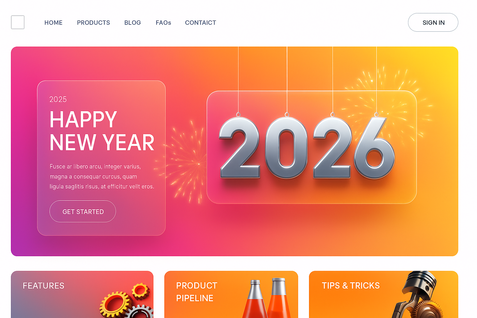 /Collection: /by davooda/Type: PNG/A vibrant landing page design for New Year 2026 featuring 3D numbers and a gradient background. Includes glassmorphism panels, call-to-action buttons, and product sections.