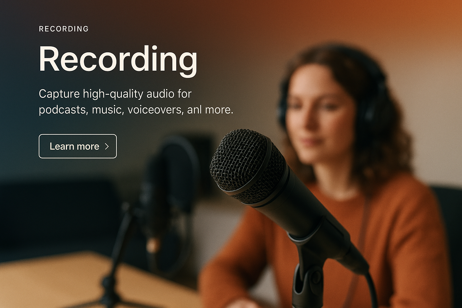 A visually appealing web page design featuring a microphone and a person recording. The layout includes a gradient background and a clear call-to-action button.