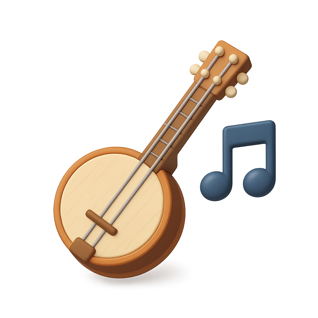 An artistic 3D representation of a banjo alongside a music note, featuring a transparent background. The banjo is displayed in a three-quarter view, emphasizing its wooden texture and design.