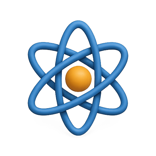 /Collection: /by davooda/Type: PNG/A modern and colorful atom icon featuring a central orange sphere with blue orbiting rings, ideal for educational content related to science, technology, and innovation.